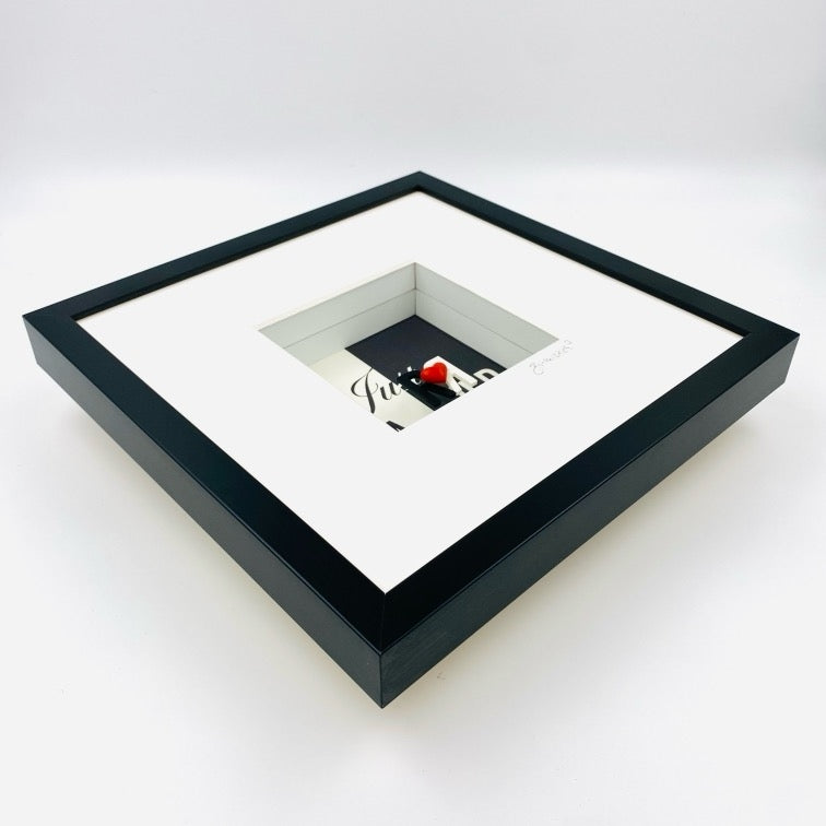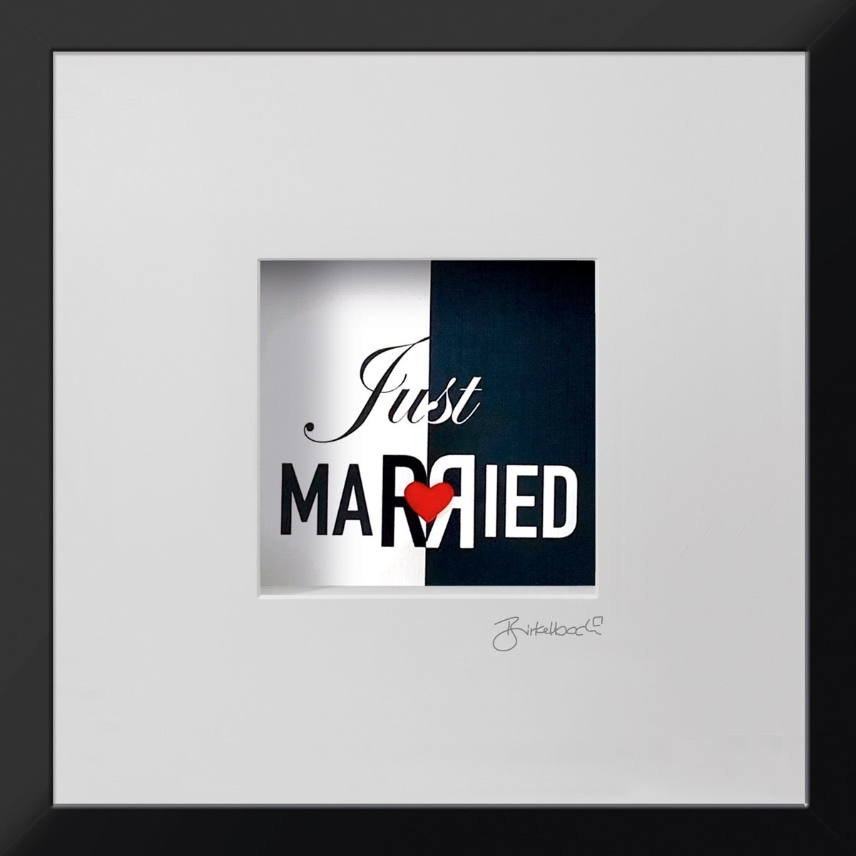 Just married: frisch verheiratet! Ein wunderschönes kleines Objektbild, dass die Verbundenheit des jungen Paares auf minimalistische Weise darstellt: links die Braut in weiss, rechts der Bräutigam in schwarzem Rock und beide herzlich miteinander verbunden. Ein passendes Geschenk für jedes Hochzeitspaar!
