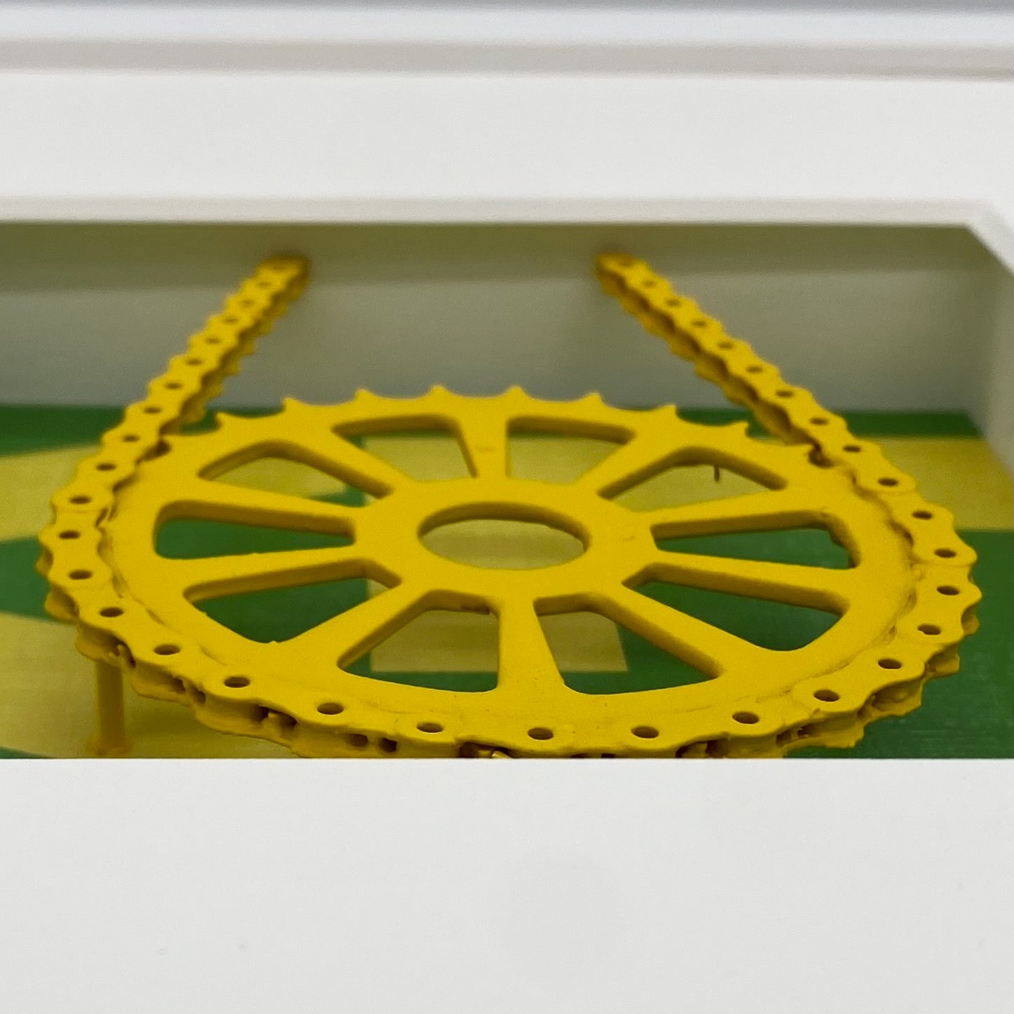 Endlich wieder aufs Rad steigen. Die Kraft spüren, wenn der Drehkranz das Rennrad die Straße entlang schnurren lässt. Ein Objektbild, dass gleichermaßen Sportlichkeit, Emotion und Technik zum Ausdruck bringt. Alles was den Radfahrer bestätigt, sein Rad zu lieben. Ein 3D-Bild in den Farben des grünen und gelben Trikots. Ein wunderbares Präsent für alle, die den Rennradsport lieben.